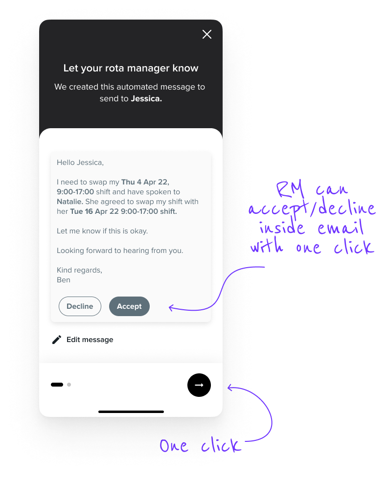 No unnecessary stress over what to write to the rota manager - an automated message does that for the doctor. The rota manager can accept/decline the request with one click which will instantly update the status in the app.